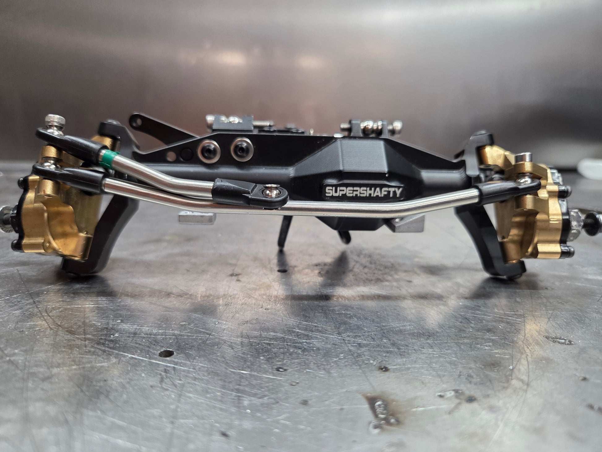 Made of Aluminum, this Mount was designed for SuperShafty CP43 FRONT Portal Axles, in a Leaf Under orientation. Being a Combination Style Leaf Mount, they are compatible with any 1/10 scale Leaf Spring Chassis on the Market!